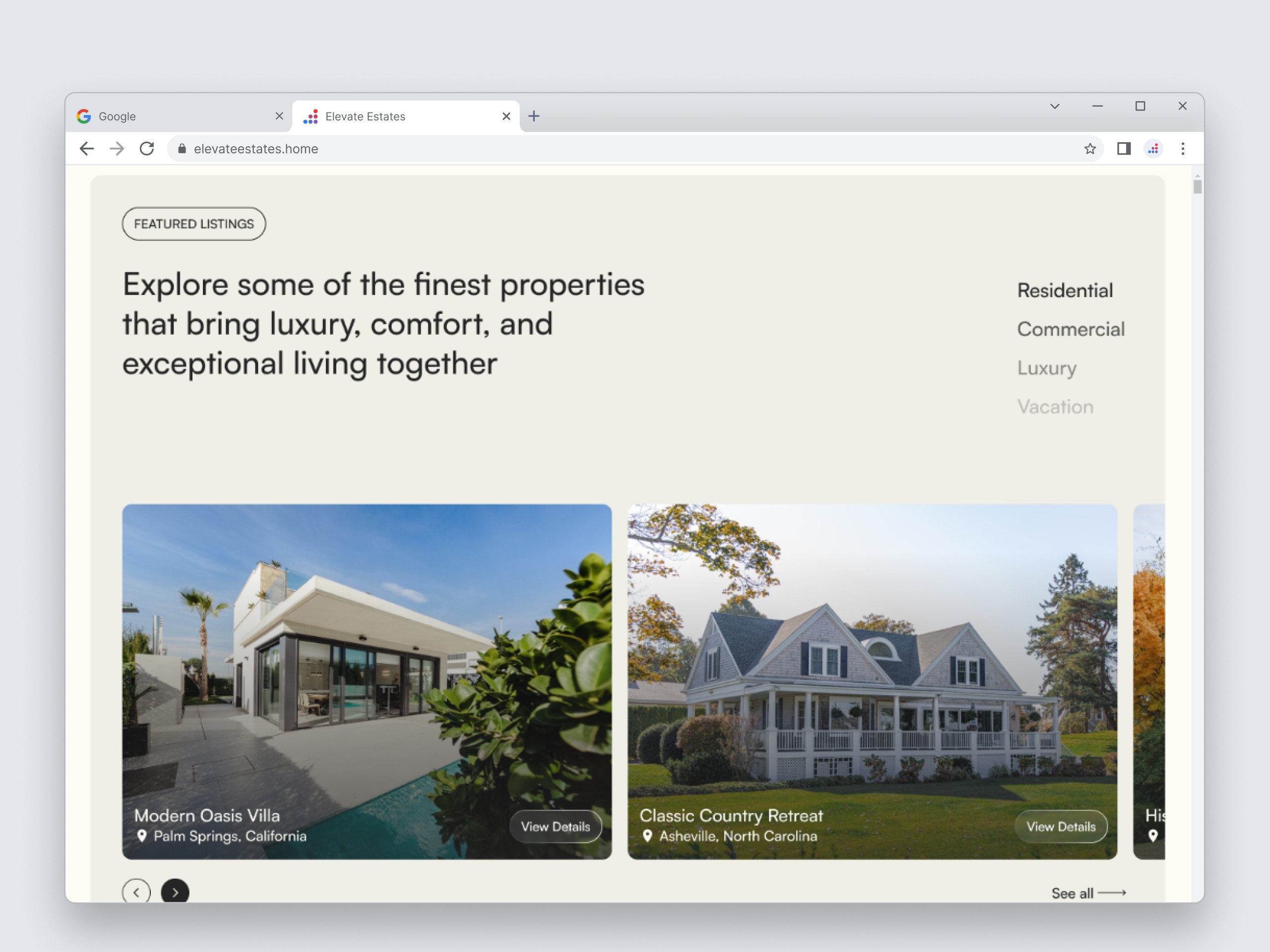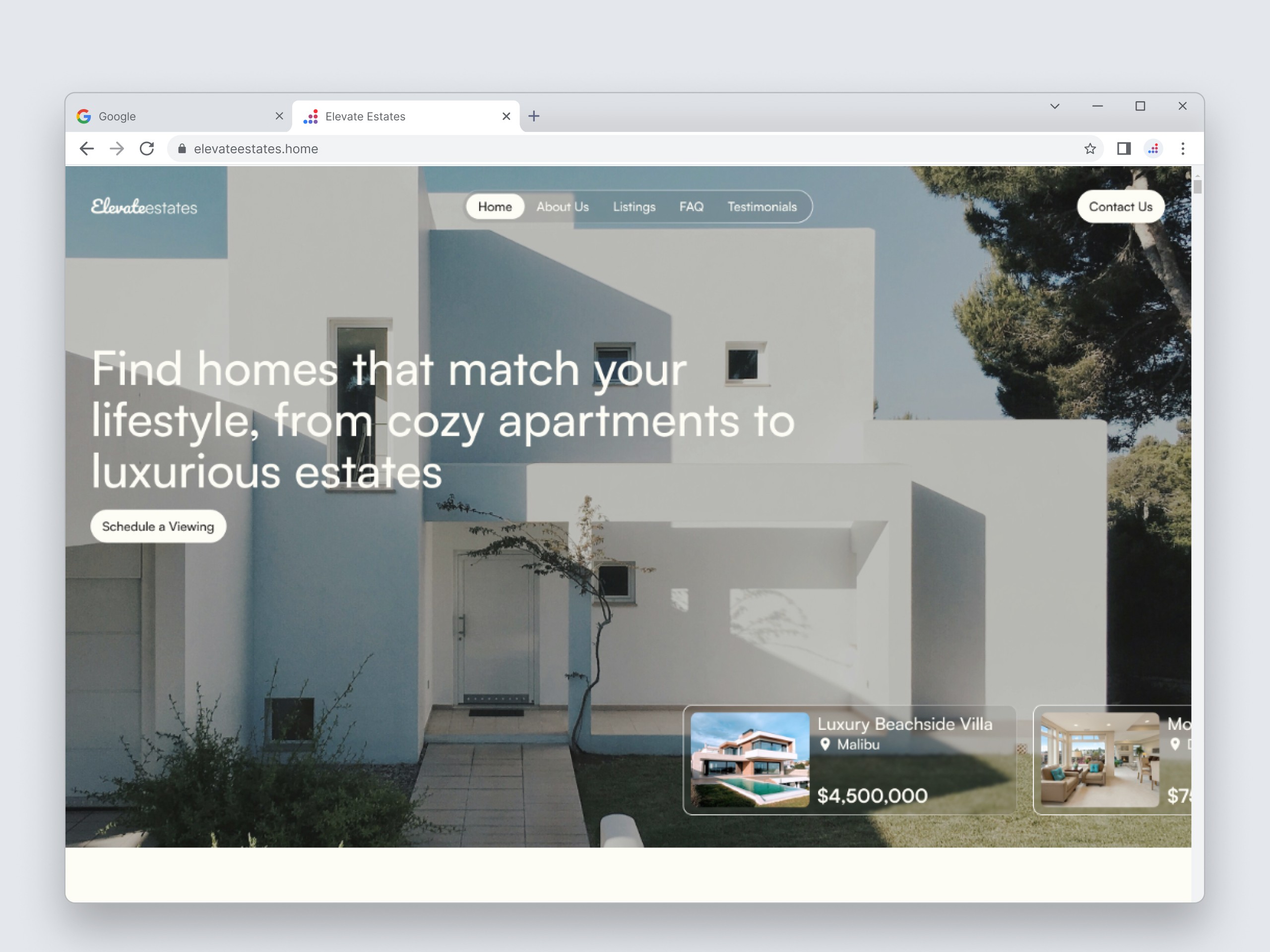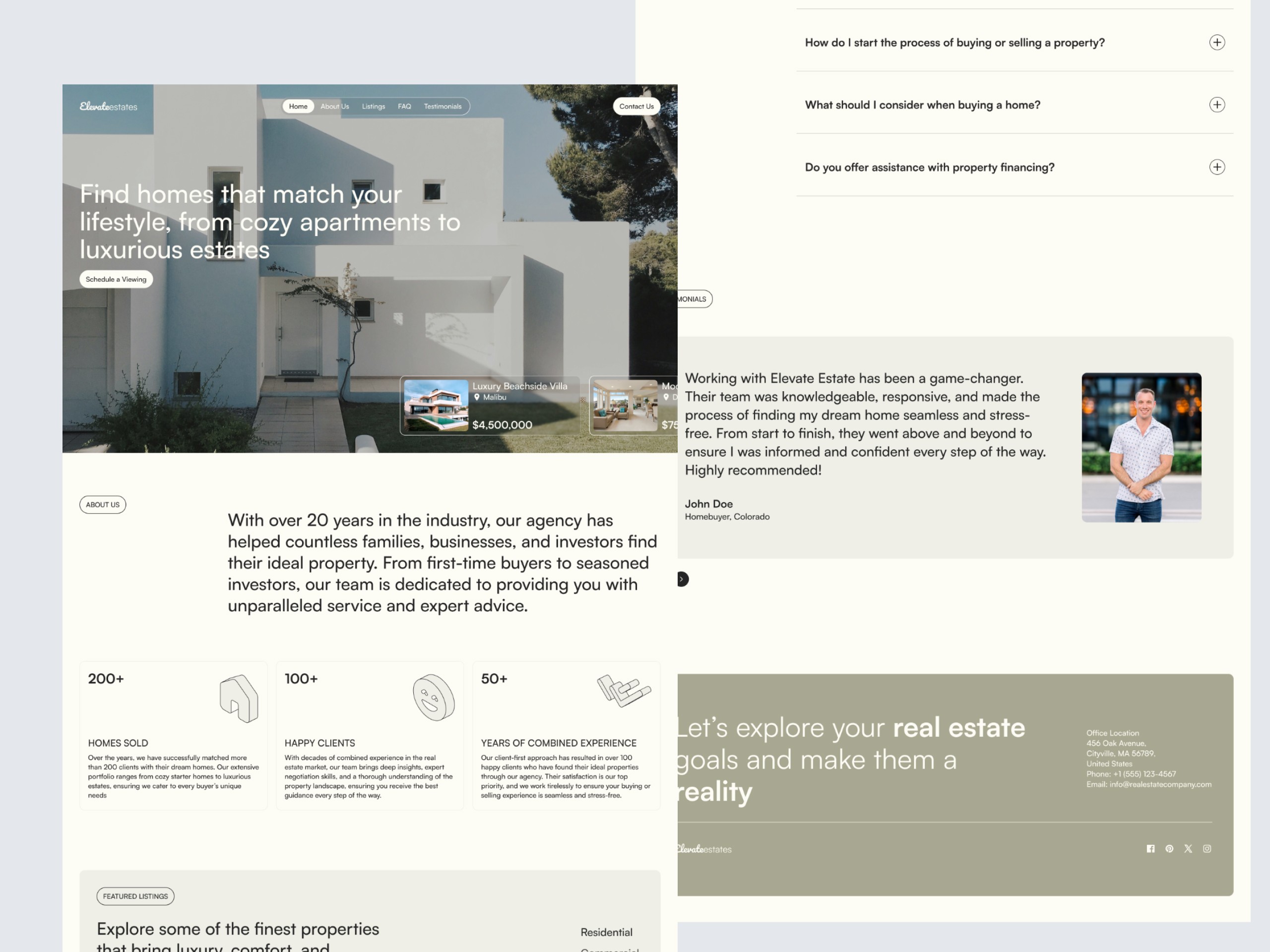 Elevate Estates is a modern real estate platform designed to help users discover their perfect home through an intuitive and elegant interface. The project focused on creating a seamless experience for browsing luxury properties while maintaining sophistication and user-friendly navigation.