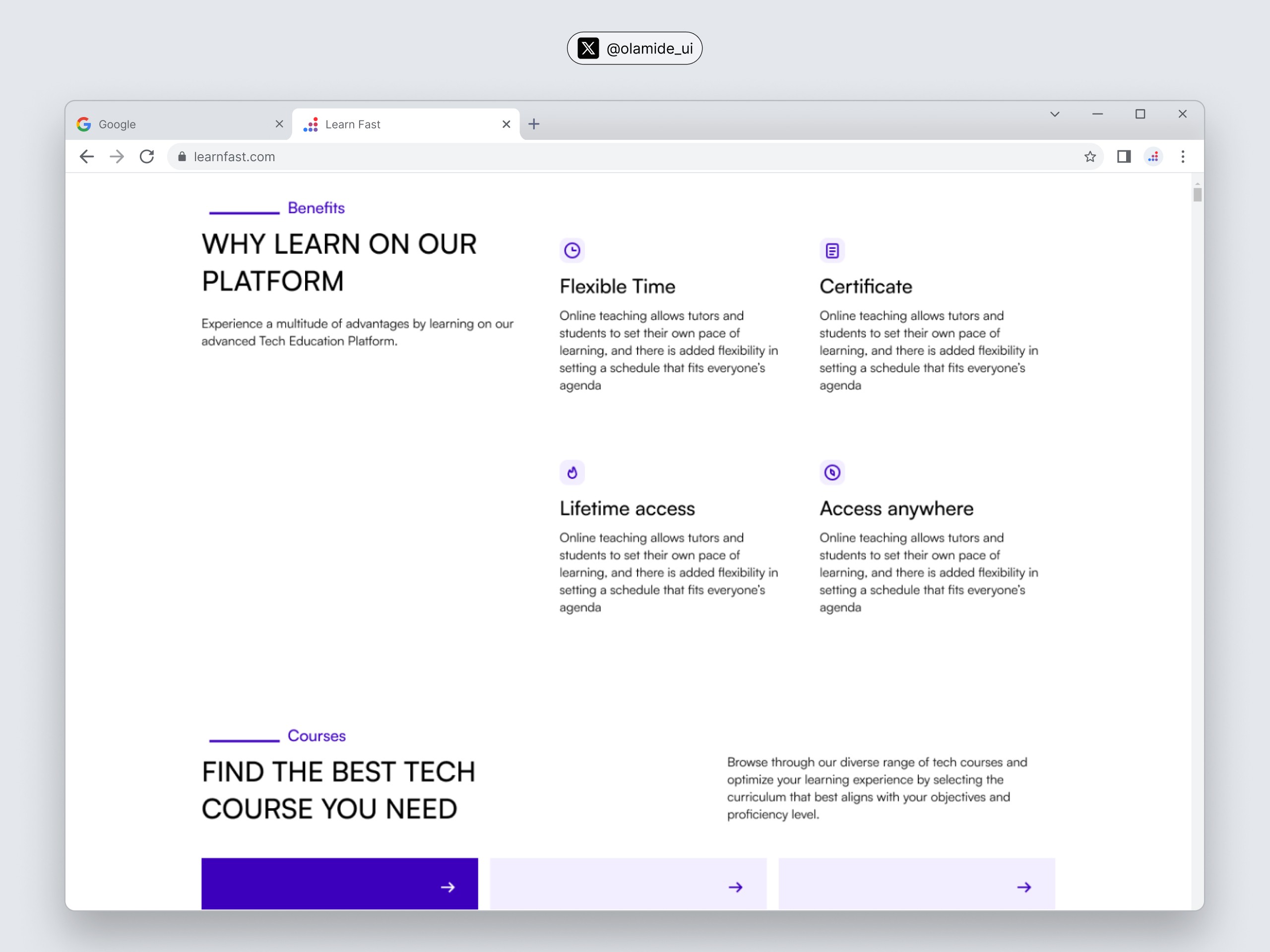 Focused Content Hierarchy: Key sections like "Benefits," "Courses," and "Tutors" are prominently displayed, ensuring users can quickly understand the platform’s unique offerings.